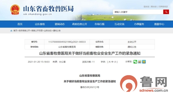 鲁网1月20日讯(记者 范金鑫)1月20日,山东省畜牧兽医局网站发布《关于做好当前畜牧业安全生产工作的紧急通知》(以下简称《通知》),切实做好当前我省畜牧行业安全生产相关工作。