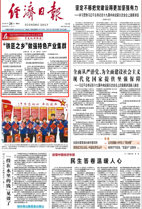 1月24日,《经济日报》头版头条以《“铁匠之乡”做强特色产业集群》为题聚焦章丘,展现了章丘做大做强特色产业集群,崛起“科创长廊”“智造长廊”“生态长廊”“文化长廊”等“长廊经济”,让章丘产业发展从“一枝独秀”到“万紫千红”的生动实践。