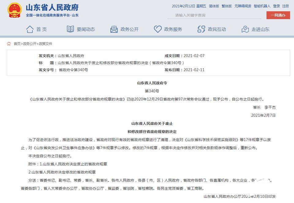 山东省政府发布政府令!废止17件规章、修改7件规章