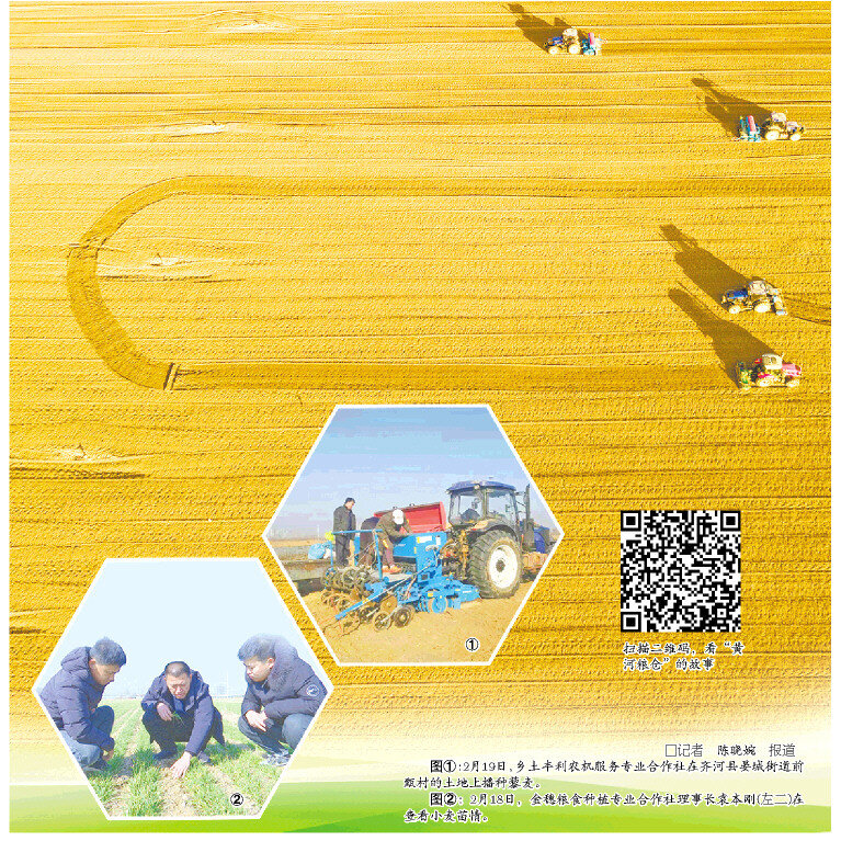 □记者 陈晓婉 报道 图①:2月19日,乡土丰利农机服务专业合作社在齐河县晏城街道前甄村的土地上播种藜麦。 图②:2月18日,金穗粮食种植专业合作社理事长袁本刚(左二)在查看小麦苗情。