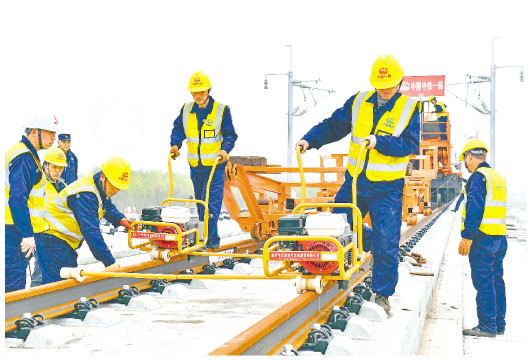 3月15日,工作人员在鲁南高铁曲阜至兰考(山东段)进行铺轨作业。□新华社记者郭绪雷报道