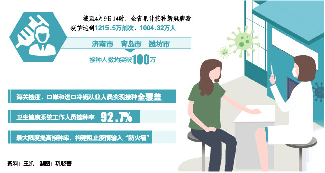 9日,根据山东省免疫规划信息系统统计,截至4月9日14时,全省累计接种新冠病毒疫苗达到1215.5万剂次、1004.32万人,济南市、青岛市和潍坊市接种人数均突破100万。海关检疫、口岸和进口冷链从业人员实现接种全覆盖,卫生健康系统工作人员接种率92.7%。