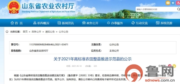 鲁网·泰山财经5月11日讯(记者 范金鑫)5月10日,山东省农业农村厅网站发布《关于2021年高标准农田整县推进示范县的公示》的通知,确定商河县等16个县(市、区)为2021年高标准农田整县推进示范县,现予公示。公示时间为2021年5月10日至5月14日。