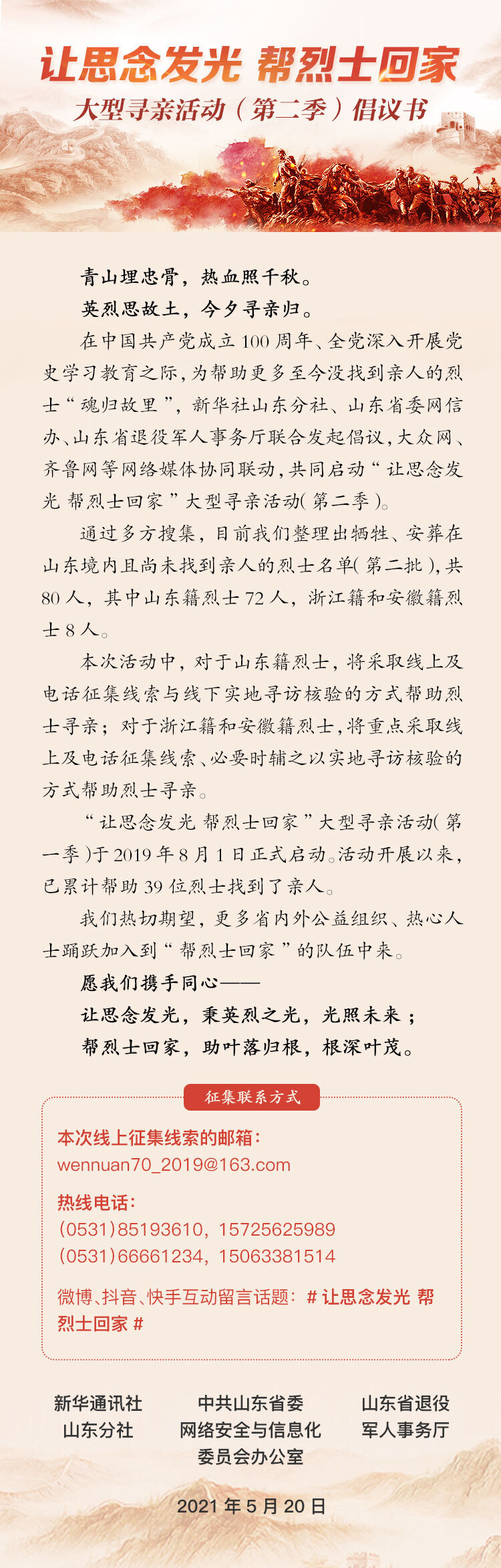 “青山埋忠骨,热血照千秋。英烈思故土,今夕寻亲归。”在中国共产党成立100周年、全党深入开展党史学习教育之际,为帮助更多至今没找到亲人的烈士“魂归故里”,5月20日,新华社山东分社、山东省委网信办、山东省退役军人事务厅联合发起倡议,大众网、齐鲁网等网络媒体协同联动,共同启动“让思念发光 帮烈士回家”大型寻亲活动(第二季)。倡议书发出以来,“烈士寻亲”热线被打爆,热线电话来自山东省内十几个城市,还有黑龙江、安徽、河北等全国各地的热心网友。