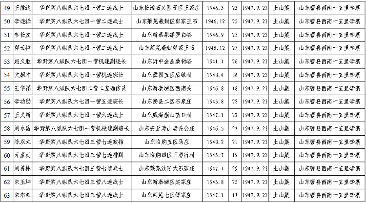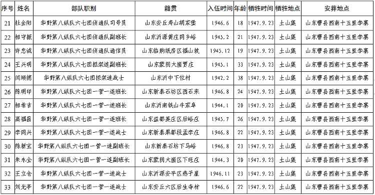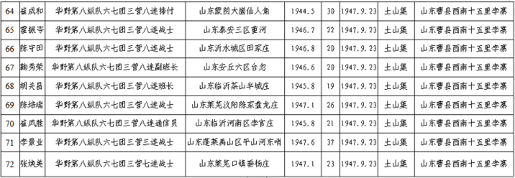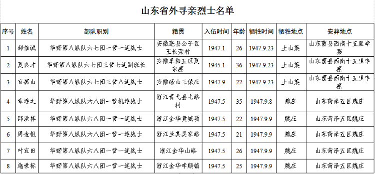 潍坊、泰安、临沂、淄博、安徽……记者了解到,目前通过多方搜集,“让思念发光 帮烈士回家”大型寻亲活动整理出牺牲、安葬在山东境内且尚未找到亲人的烈士名单(第二批)共80人,其中山东籍烈士72人,浙江籍和安徽籍烈士8人。