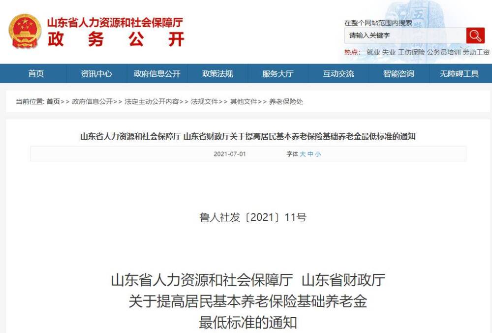 日前,山东省人力资源和社会保障厅、山东省财政厅印发《关于提高居民基本养老保险基础养老金最低标准的通知》。