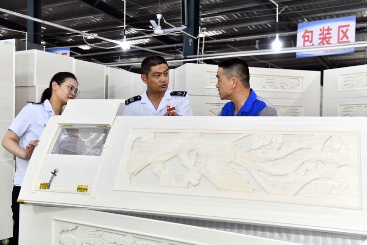 6月16日,在菏泽德弘木制品有限公司,曹县税务局的工作人员上门走访,介绍出口退税相关优惠政策。新华社记者郭绪雷摄