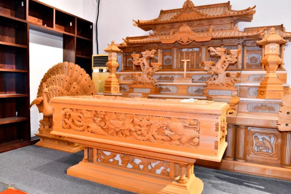 6月17日,在曹县云龙木雕工艺有限公司展示的出口日本的棺木、祭坛等殡仪产品。新华社记者郭绪雷摄