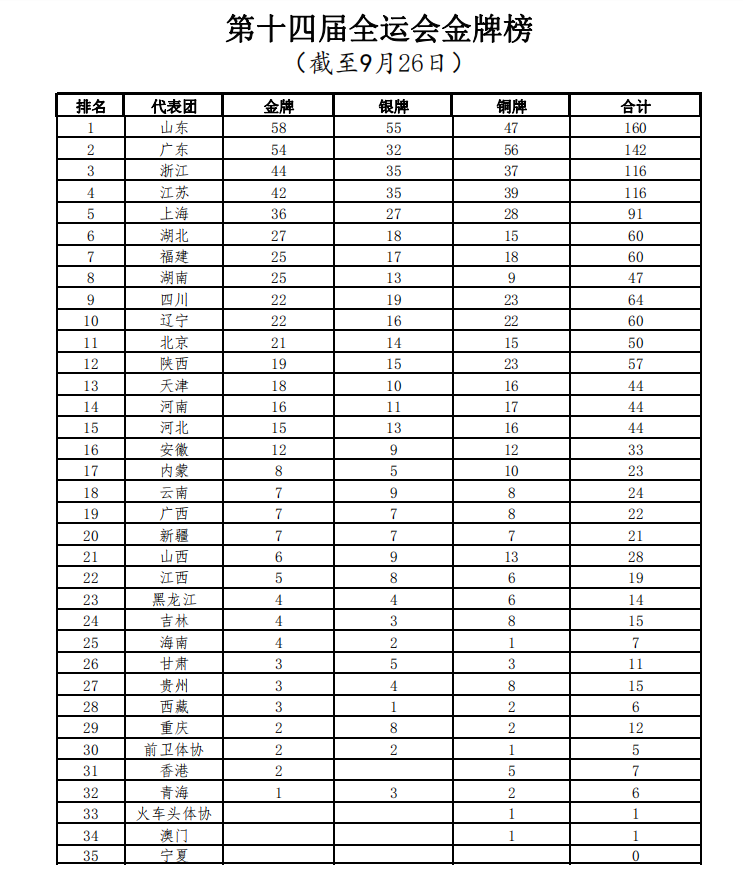 9月26日晚上,第十四届全运会比赛全部结束,山东代表团在最后一天比赛中再揽4金,最终以58枚金牌、55枚银牌、47枚铜牌,总计160枚奖牌完美收官。金牌总数与奖牌总数均位列全国首位。