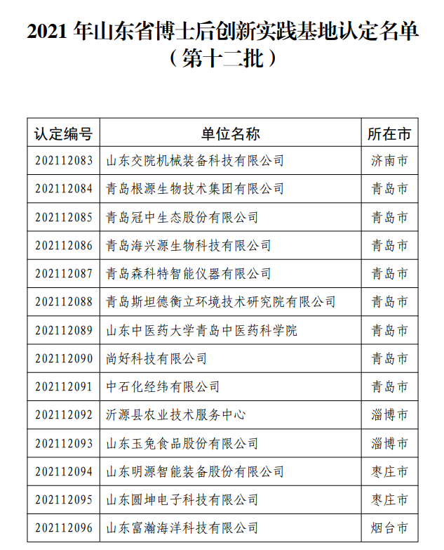 近日,山东省人力资源和社会保障厅印发《关于2021年山东省博士后创新实践基地认定名单的公告(第十二批)》。