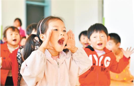 2021年10月12日,在菏泽市东明县尚庄社区幼儿园,小朋友在学唱儿歌。(□新华社记者郭绪雷报道)