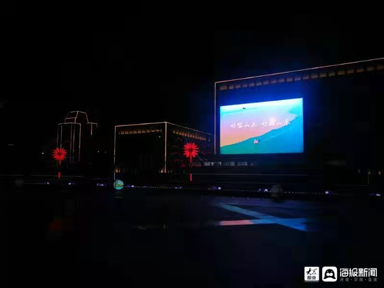 临沂城市地标点亮“好品山东”主题灯光秀。