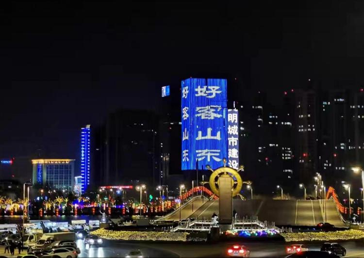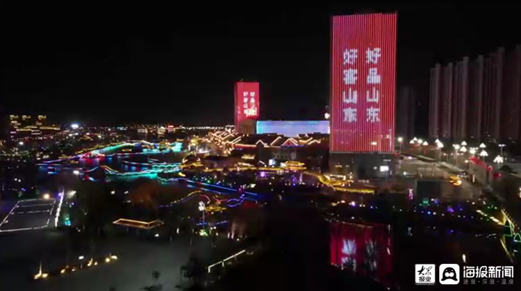 菏泽城市地标点亮“好品山东”主题灯光秀。