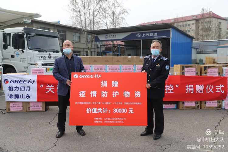 4月2日上午,格力电器山东分公司、山东盛工达电器有限公司来到济南市机械化清扫大队,向一直奋战在城市保洁防疫一线的职工送来了防疫物资。格力电器山东分公司济德聊大区销售总监靳宝川向一直奋战在城市保洁一线,为城市疫情防控做出贡献的城管职工表示由衷地敬佩,感谢济南城管人为城市洁净做出的巨大贡献,并表示将和企业员工全力以赴的支持济南城管事业的不断发展,为美丽泉城的经济建设做出更大的贡献!(通讯员 单机乔 宋振飞)