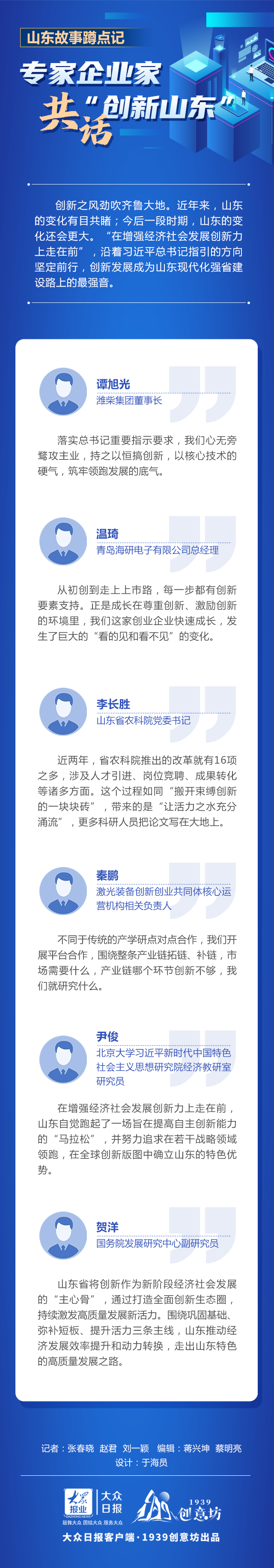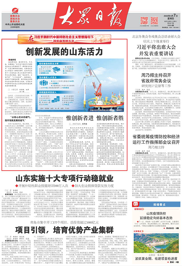 今日的山东,孜孜以求的是推动形成全区域、全要素、全链条、全社会的全域创新新格局。2022年初我省确定的“十大创新”全面铺开、纵深推进,创新已渗透到经济社会发展方方面面。