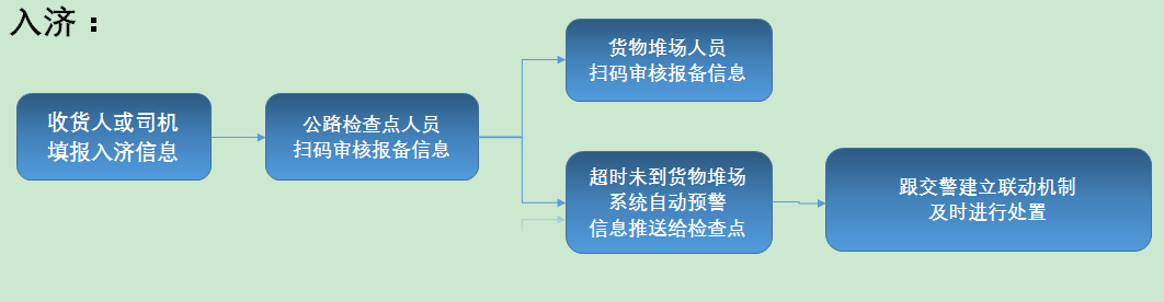 来自重点地区和跨省入济货车或济南收货方,点击“入济货车报备”提前进行网上填报承诺,自动生成二维码,随时亮码通行,“点对点”闭环运输的无需再书面承诺。通过扫码查验、摄像头自动识别、实时追溯处置等信息化手段,实现信息提前填报、现场快速核验、过程精准管控,切实保障运输畅通和市民安全。