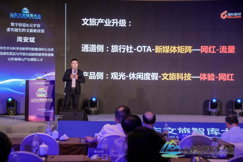 在发展论坛环节,国内文旅行业专家、知名学者共同研讨文旅产业创新发展之路,为文旅产业发展建言献策。戴斌、孙小荣通过线上方式做主旨演讲,探讨智库建设与文旅产业发展以及文旅品牌营销的深层逻辑。清华艺科院数创中心主任、山东省泰山产业领军人才周安斌;山东旅游职业学院党委书记、山东省旅游专家委员会委员、山东省文旅产业创新研究院首席专家陈国忠在现场做主旨演讲,围绕虚实融生的文旅新应用、以创新驱动文旅产业高质量发展等主题展开系统论述。