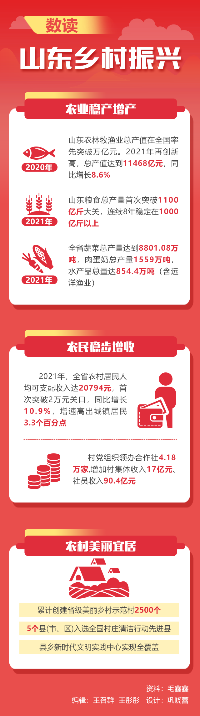 牢记总书记嘱托,山东突出产业支撑,乡村振兴基础越来越好。加快构建现代农业产业体系,烟台苹果、寿光蔬菜等产业集群迈向千亿级。一大批龙头企业创新发展,新型经营主体数量居全国前列。休闲农业、创意农业等新业态竞相涌现。2021年,我省农村居民人均可支配收入20794元,比上年增长10.9%。