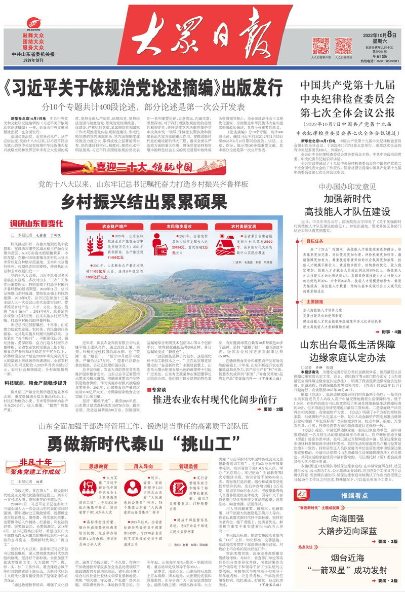 习近平总书记对山东情深似海、厚望如山。党的十八大以来,习近平总书记4次亲临山东视察,多次作出重要指示批示,为山东发展把脉定向、掌舵领航。在以习近平同志为核心的党中央坚强领导下,省委、省政府团结带领全省人民勇担使命、砥砺奋进,山东迎来了发展质量最好、城乡面貌变化最大、广大人民群众得到实惠最多的十年。9月5日起,大众日报推出“领航中国·调研山东看变化”大型全媒体主题报道,展现山东深入贯彻落实习近平总书记重要指示要求,踔厉奋发、勇毅前行的生动实践,激励全省党员干部群众以实际行动迎接党的二十大胜利召开。今天刊发第八组报道《乡村振兴结出累累硕果》——