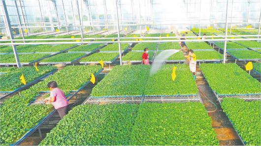 金秋时节,在聊城市茌平区贾寨镇耿店村育苗温室大棚里,村民忙着分拣辣椒苗。(□通讯员赵玉国报道)