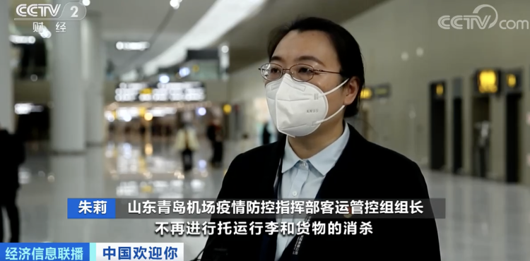 山东青岛机场疫情防控指挥部客运管控组组长朱莉:飞机落地后,不再进行托运行李和货物的消杀,旅客通行效率大幅提升。据初步统计,旅客从下机到提取完行李的全过程平均只用了40到50分钟,相较于之前两个半小时的保障时间缩短了三分之二。
