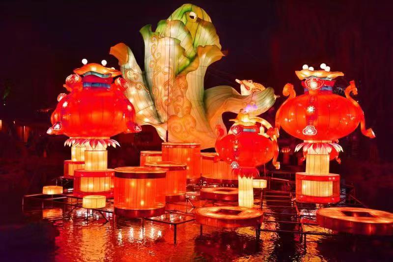 极具看点的还有《百财如意》灯组,该灯组以白菜为主体进行设计,白菜有招财、发财、百财聚来之意。一只硕大的金蟾镶满钱币,代表招财进宝。周边铺满铜钱和如意灯笼,祝愿新年百财如意、前程锦绣。