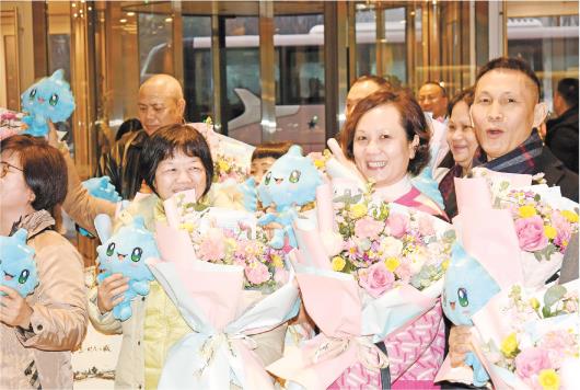 2月12日,来自香港的游客在欢迎仪式上接受鲜花和玩偶公仔。(□新华社发)