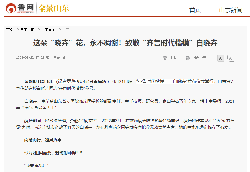 英模已逝,精神长存。鲁网文字作品《这朵“晓卉”花,永不凋谢!致敬“齐鲁时代楷模”白晓卉》通过采访齐鲁时代楷模白晓卉的同事和学生,展现楷模人物立足岗位、拼搏奉献的生动故事。社会各界在了解齐鲁时代楷模白晓卉的事迹后,备受鼓舞与感动,并在先进事迹中感悟和汲取奋进力量,迅速掀起向齐鲁时代楷模学习的热潮,让这朵“晓卉”花,开遍大江南北,永不凋谢。