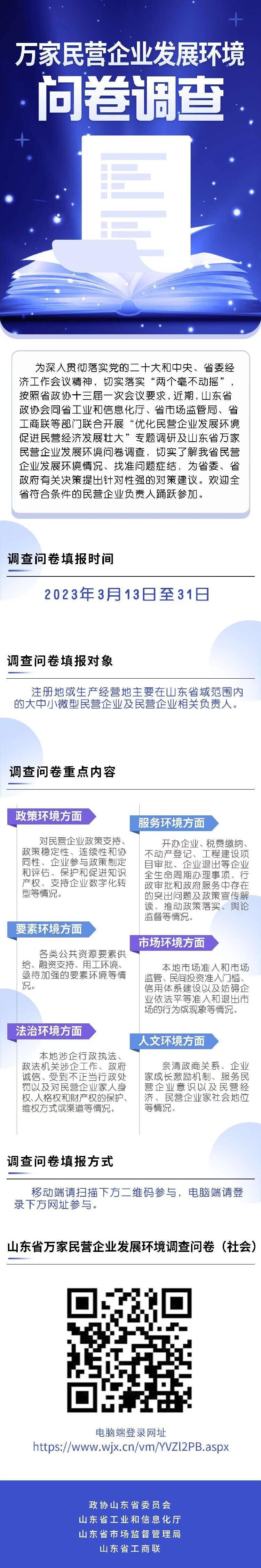 为深入贯彻落实党的二十大和中央、省委经济工作会议精神,切实落实“两个毫不动摇”,按照省政协十三届一次会议要求,近期,省政协会同省工业和信息化厅、省市场监管局、省工商联等部门联合开展“优化民营企业发展环境 促进民营经济发展壮大”专题调研及山东省万家民营企业发展环境问卷调查,切实了解我省民营企业发展环境情况、找准问题症结,为省委、省政府有关决策提出针对性强的对策建议。欢迎全省符合条件的民营企业负责人踊跃参加。