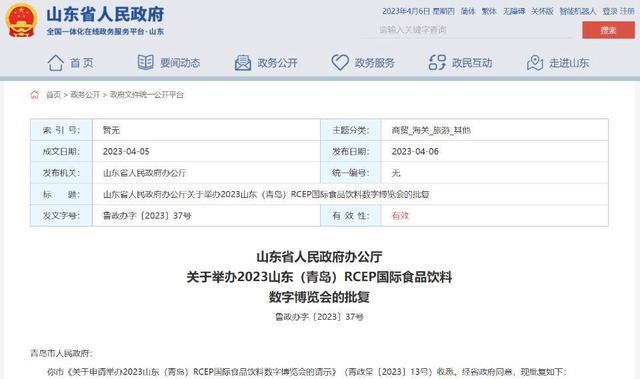 4月6日,山东省政府网站发布《山东省人民政府办公厅关于举办2023山东(青岛)RCEP国际食品饮料数字博览会的批复》,同意于2023年6月27日至29日在青岛市举办2023山东(青岛)RCEP国际食品饮料数字博览会。