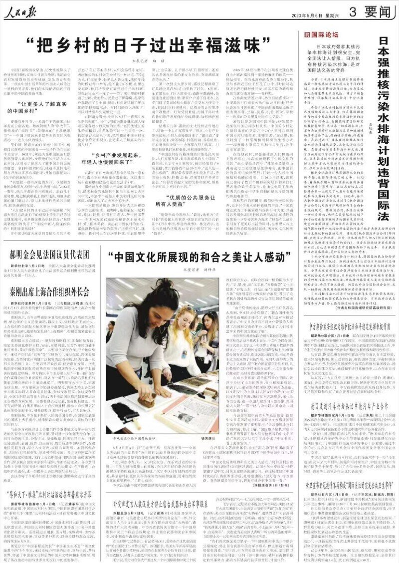 鲁网5月6日讯 5月6日出版的《人民日报》在第3版以《“中国文化所展现的和合之美让人感动”》为题关注以“尼山传千载 岱海连世界——全球文明倡议的生动故事”为主题的2023年维也纳联合国中文日系列活动,以及山东省与不同文明携手共进,践行互利共赢理念,深化全方位交流,进一步加大相互间开放合作,共同融入共建“一带一路”,为构建人类命运共同体作出的新的贡献。