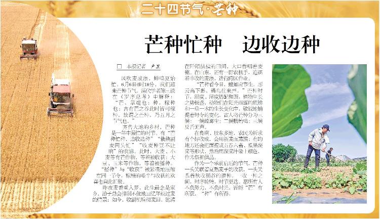 齐鲁大地的乡村,芒种是一年中最忙的时节。有“芒种忙种,边收边种”“栽秧割麦两头忙”“收麦种豆不让晌”的农谚。此时,大麦、小麦等有芒作物,等着被收获;大豆、玉米等作物,等着被播种。“播种”与“收获”被紧凑地压缩在同一节令,稼穑的艰辛与收获的欢喜也自此汇聚。