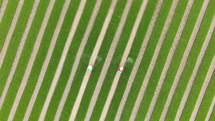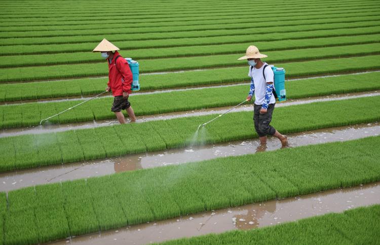 6月5日,临沂市郯城县马头镇,郯丰种植农民专业合作社社员为水稻秧苗喷洒除草剂。
