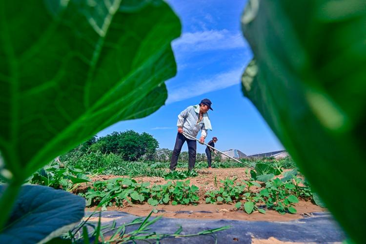 芒种将至,田野处处一派忙碌。6月5日,农民在山东省青州市高柳镇南马兰村一处葫芦种植基地劳作。