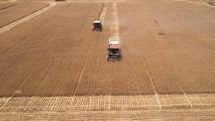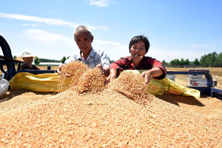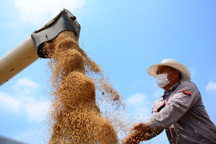 6月5日,临沂市沂南县蒲汪镇马家拐头村,联合收割机在收获小麦。当天,马家拐村合作社的202亩小麦喜获丰收,亩产达800斤。