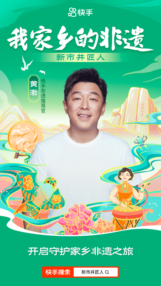 活动也邀请到了黄渤作为快手非遗推荐官号召大家开启守护家乡非遗之旅,而“跟着局长玩非遗”系列直播,则吸引到山东省济宁市曲阜市文旅局长孔凡波、四川省甘孜州文旅局长刘洪、新疆维吾尔自治区巴州文旅副局长何淼推介家乡非遗;「我家乡的非遗」视频挑战赛,引来@泥巴哥(腾哥)、@郎佳子彧等达人齐聚#新市井匠人、#我家乡的非遗 话题,用记录的方式守护传统文化;互动抽奖活动,则唤起全民参与非遗传承的积极性,促使更多人了解非遗、走近非遗、守护非遗。