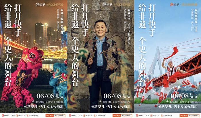 除了在线上为非遗传承提供沃土,快手还在线下给非遗搭建了一个更大的舞台——为展示中国非遗传承、营造城市传统文化氛围,6月8日快手集结@魏宗富道情皮影传承人、@胖哥醒狮-黄国森、@安塞腰鼓三哥哥等优质非遗创作者,在重庆300米高空搭建巨型“手机舞台”,举办「手上的非遗」展演。未来,「手上的非遗」将落地更多城市,为非遗匠人提供更多曝光机会。