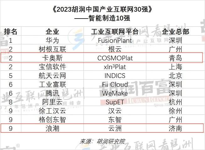 6月27日,胡润研究院首次发布《2023胡润中国产业互联网30强》,卡奥斯、浪潮2家山东企业入选智能制造10强。