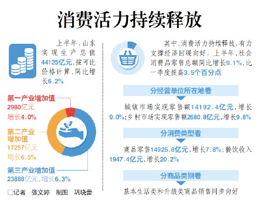 为拓展线上消费,我省实施电商“三个十”计划,打造十个电商直播基地、十个电商供应链基地和十个电商产业带,吸引电商企业等集聚发展。同时,扩大服务消费,举办第七届中华老字号(山东)博览会、北方消费品博览会等各类展会活动超400场,积极推动会展消费复苏,截至6月底,全省办展数量和面积恢复至2019年同期水平。