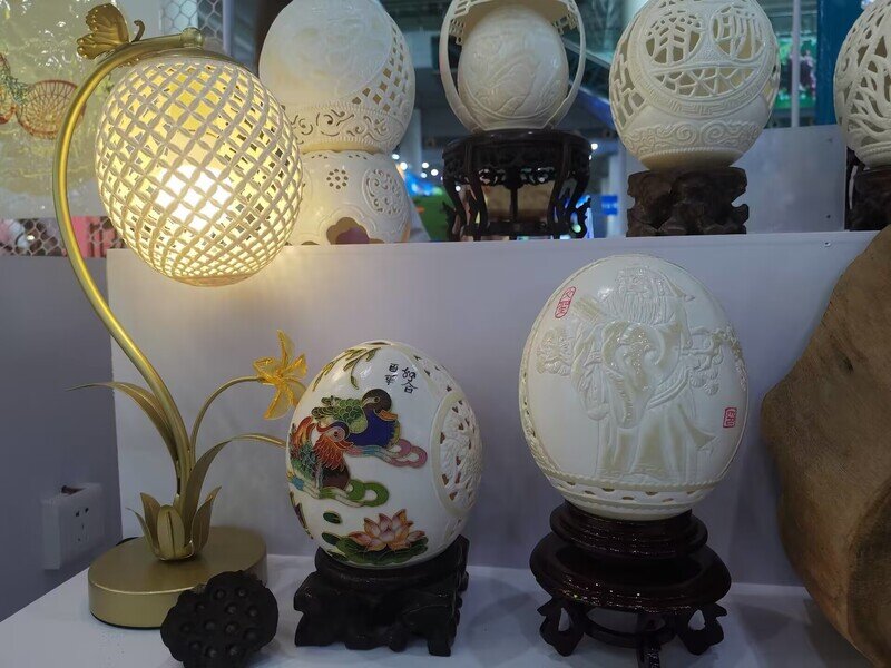 展销会现场,高茂美在鸵鸟蛋上雕刻出栩栩如生的图案,吸引了观众的目光,她从事蛋雕艺术已经近三十年。“我们蛋雕非遗参加这次展会收到了很好的效果,把我们的传统文化传递出去,让更多人看到我们的蛋雕作品。”高茂美说。