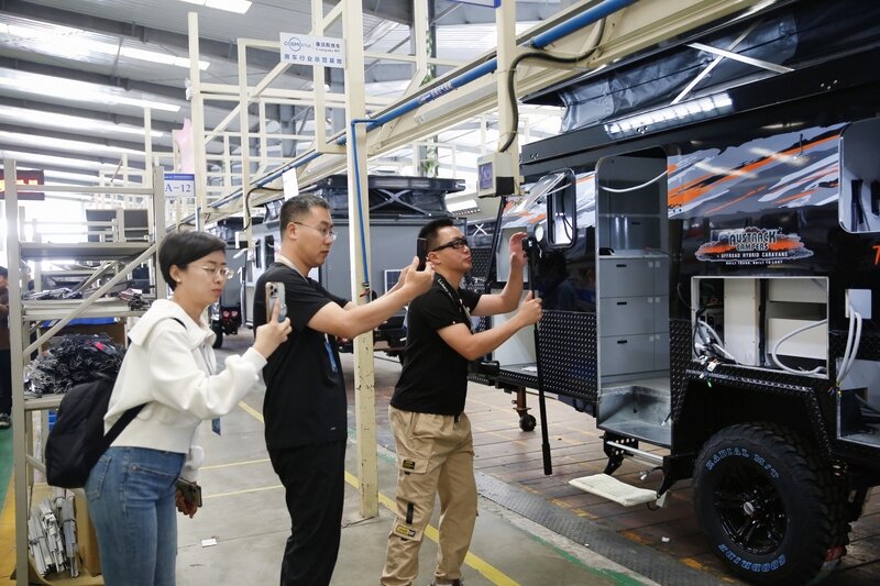 在工作人员的带领下,网络名人和媒体记者进入康派斯新能源车辆股份有限公司看到,多种拖挂式房车、自行式房车、露营地房车一字排开,硬件装配、设施安装、房车清洁,各个环节有条不紊,一派繁忙景象。
