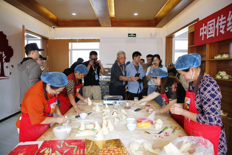 在工作人员的带领下,网络名人和媒体记者还参观到了胶东花饽饽的制作工艺和独特手法。