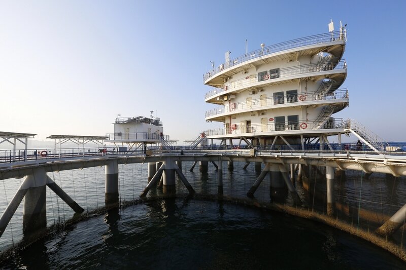 沿栈桥行走,在最北端的智慧渔场内有3个直径40米的大型圆形网箱,每个网箱养殖体积约1万立方米。