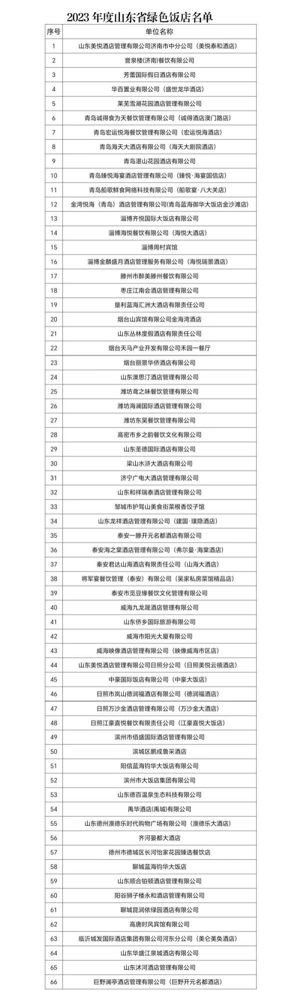 11月30日,记者从省商务厅获悉,根据《2023年全省商务工作要点》明确的工作任务,今年省商务厅组织开展了山东省“绿色饭店”创建活动,最终确定了66家企业为2023年度山东省绿色饭店,近日将名单对外发布。