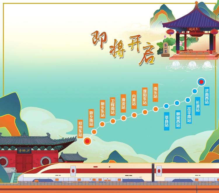 济郑高铁是国家“八纵八横”高铁网的重要连接线和沿黄陆海大通道的重要组成部分,起于济南西站,经德州、聊城、濮阳,接入郑州东站,全长405公里,其中山东段168公里,新设长清、茌平南、聊城西、莘县4座车站,设计时速350公里。对于“李精飞”们来说,高铁缩短了时空距离,让回家更便捷;而对于城市来说,高铁塑造了发展新格局。加快建设强省会、建设现代化都市圈的济南将手握这把“金钥匙”,打开通往中原腹地的一扇新大门。