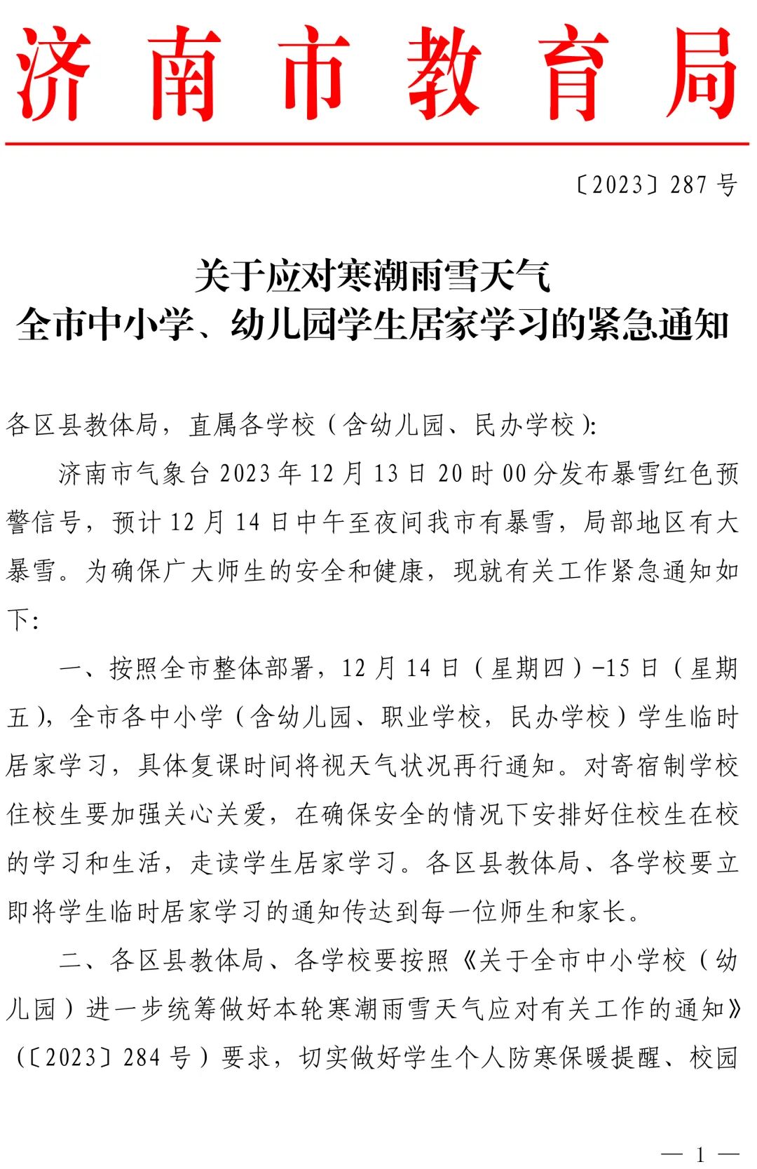 一、按照全市整体部署,12月14日(星期四)-15日(星期五),全市各中小学(含幼儿园、职业学校,民办学校)学生临时居家学习,具体复课时间将视天气状况再行通知。