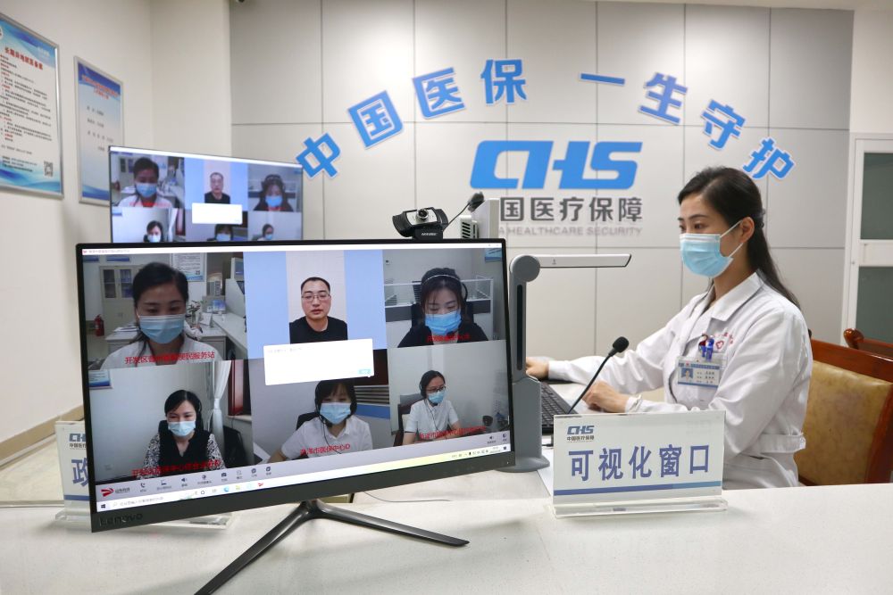 (在菏泽市一处可视化医保便民服务站,工作人员为使用“手机视频办医保”小程序的参保人员办理医保业务 图片来源/新华社)