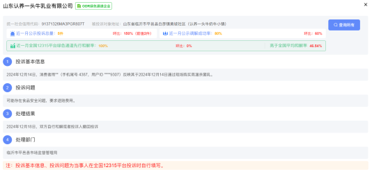 投诉信息显示,消费者(手机尾号4387,用户ID****9307)反映,其于2024年12月14日通过现场购买的认养一头牛高温杀菌乳,可能存在食品安全问题,要求认养一头牛退赔费用。临沂市平邑县市场监督管理局随后介入处理,12315平台显示处理结果是:最终双方于12月18日达成和解或者投诉人撤回投诉。
