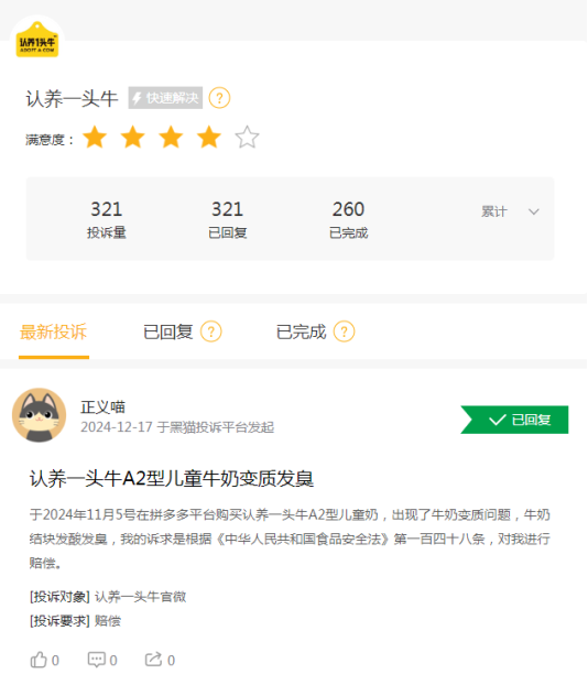 此次投诉并非孤例,据12315消费者投诉信息公示平台搜索结果显示,认养一头牛各关联公司相关投诉内容已达605条,黑猫投诉平台则达到321条,投诉内容不乏“牛奶发臭”“牛奶胀包”“牛奶喝出异物”等食品安全问题,其中牛奶变质的情况被多次提及。