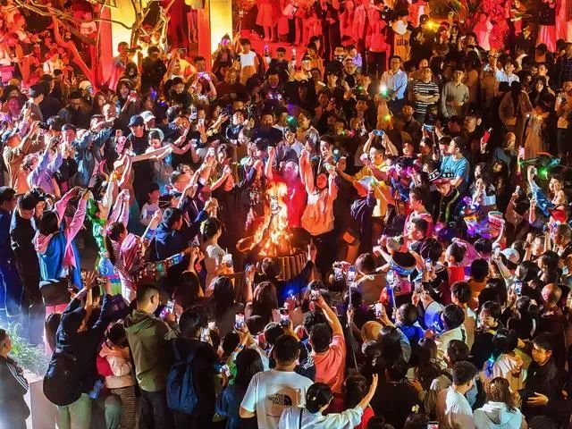 比如,在今年4月,红叶柿岩联动柿岩古村“小丽江”、沉浸式光影音乐漂流等体验项目,引入民族摇滚乐队、少数民族NPC进行沉浸式微演艺,创设异域风情场景,丰富各类商业业态,从游、赏、娱、购、食、宿多方面构建多元夜间生活。